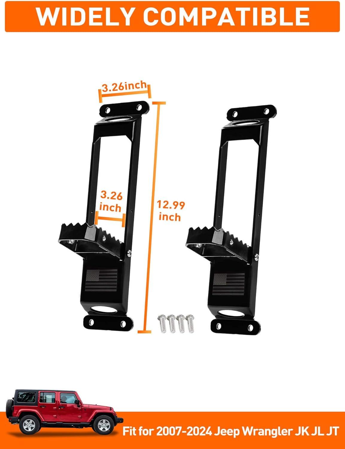 𝗖𝗨𝗦𝗧𝗢𝗠 𝗙𝗜𝗧 — Designed to fit 2007-2024 Jeep Wrangler JK JKU JL JLU 4XE and Gladiator models, these jeep door hinge foot steps seamlessly complement your car's sleek and stylish look while enhancing your driving experience.