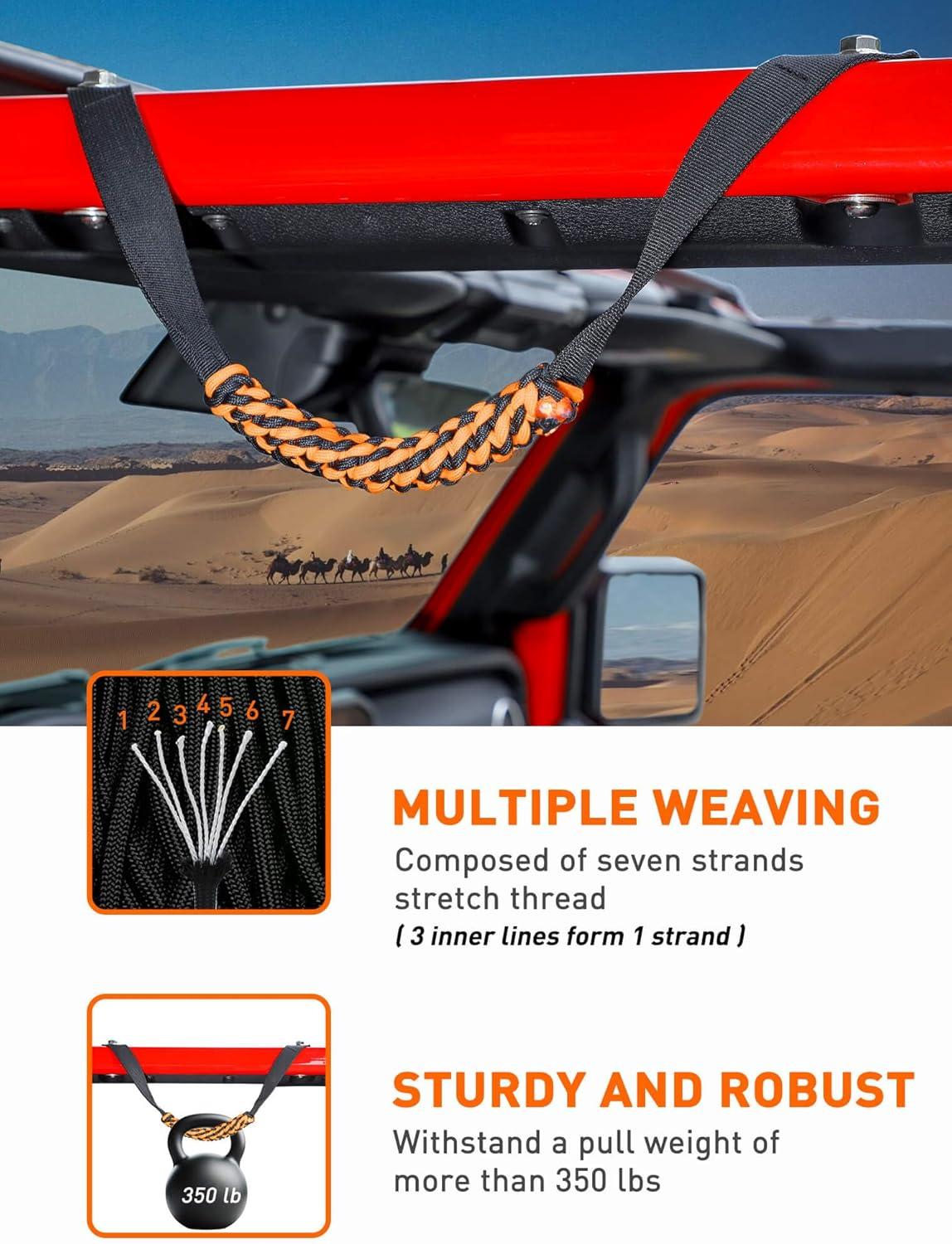 RUGGED DESIGN – Our Jeep Paracord Grab Handles are crafted with a double cobra knot of two nylon ropes and feature sturdy metal rings. They provide excellent tear resistance and a comfortable grip.