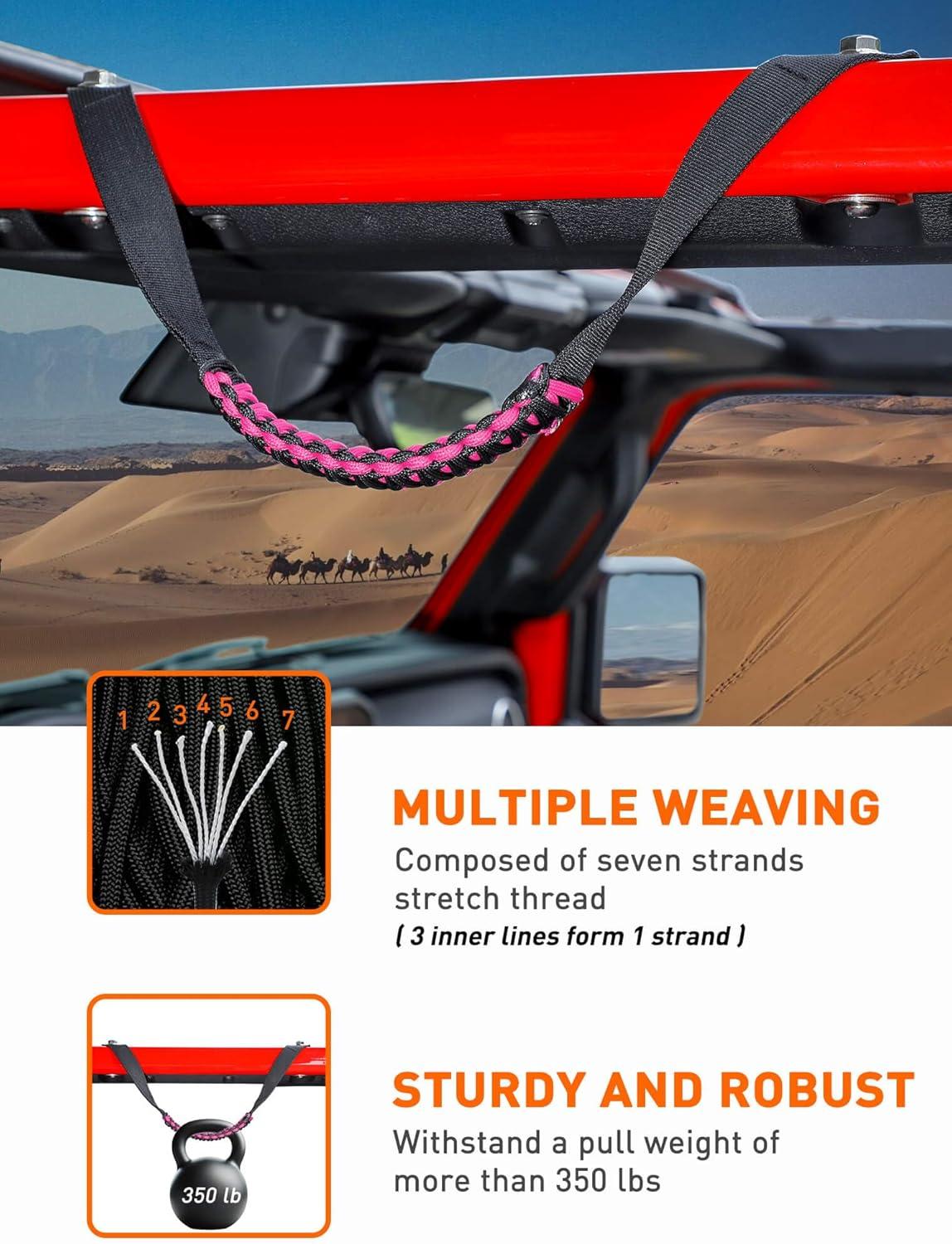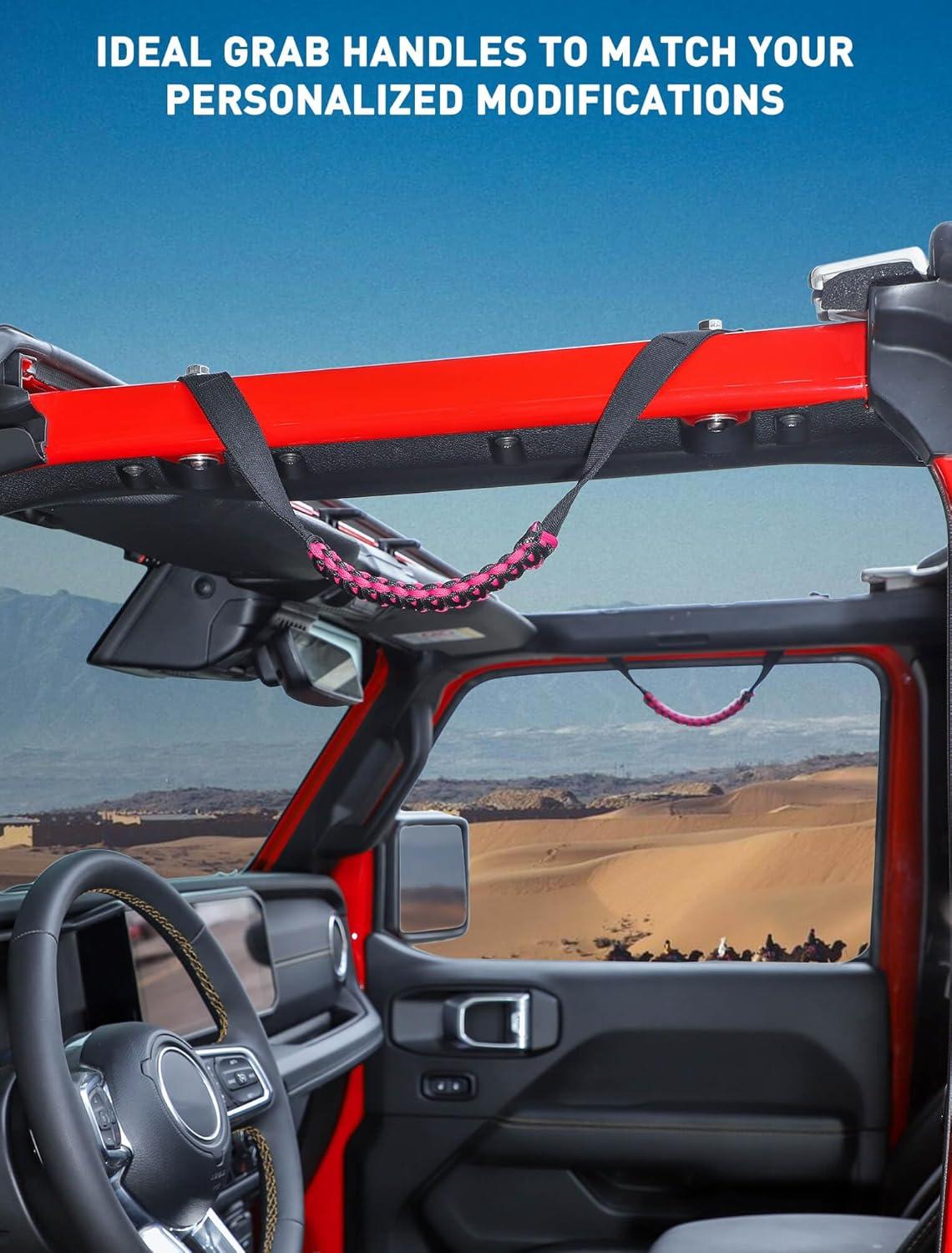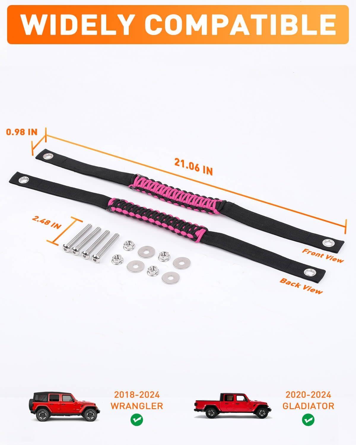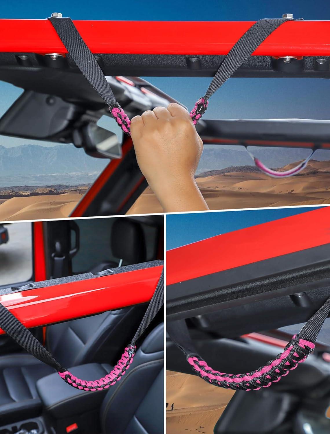 Savadicar 2 Pack Roll Bar Grab Handles for 2018-2024 Jeep Wrangler JL JLU 4XE & Gladiator JT, Roof Top Paracord Handle for Secure Grip, Essential Interior Accessories, Black(Pink)