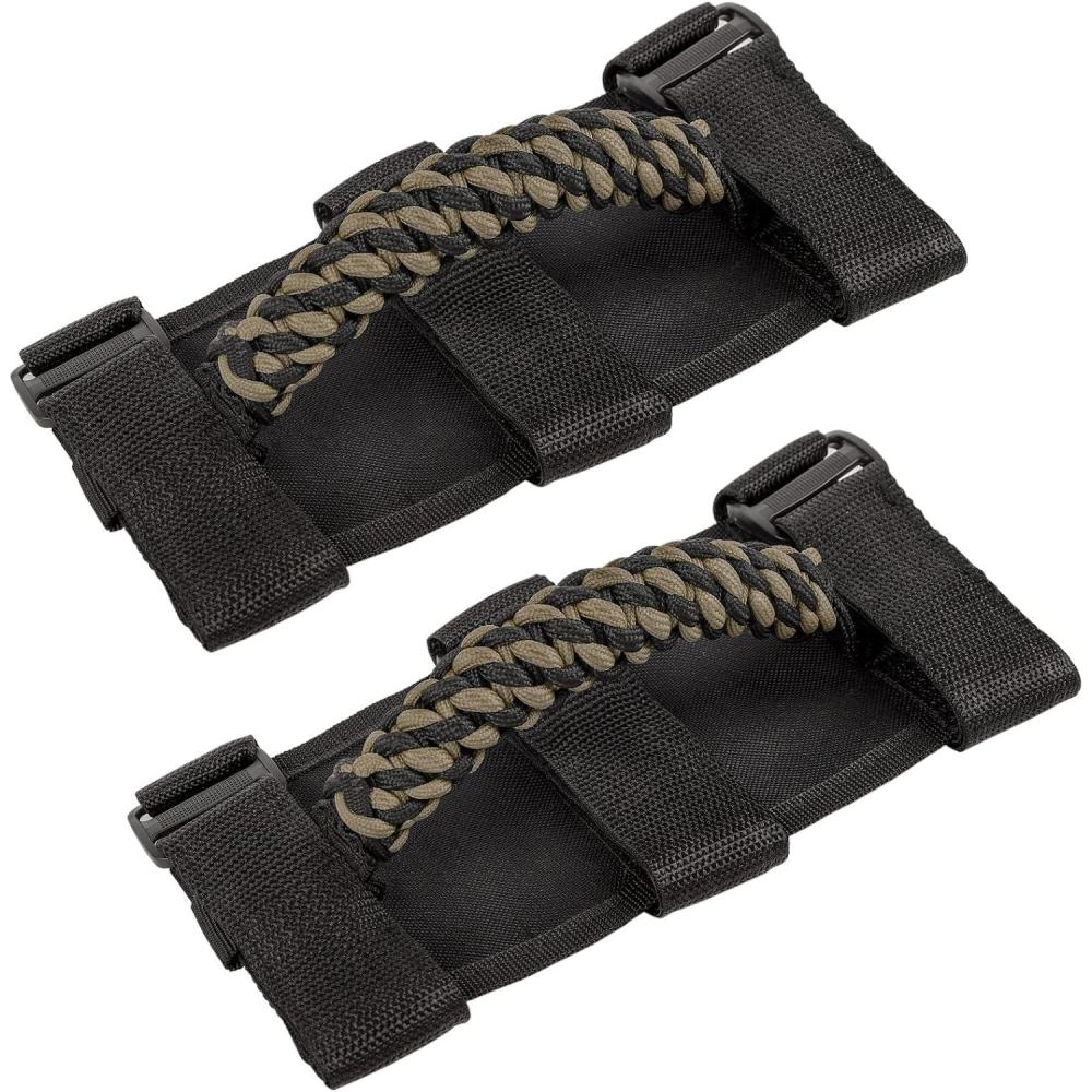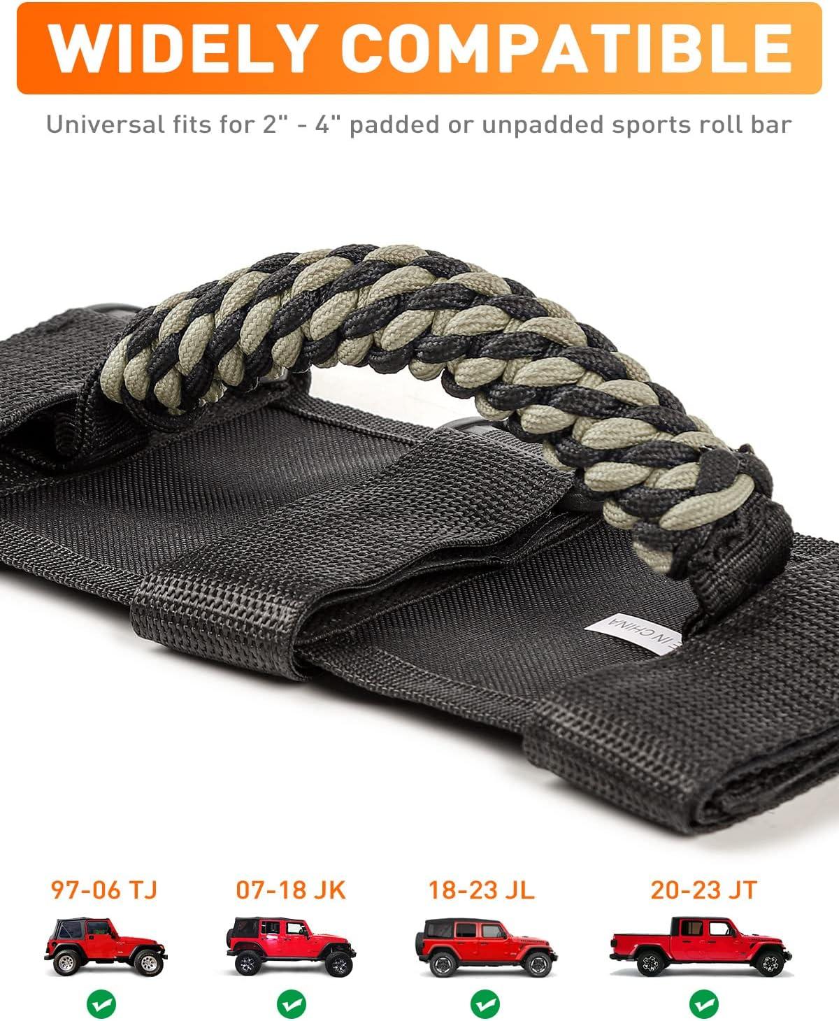 RUGGED DESIGN — Weave of Premium grade durable 7-strand braid nylon handle, matching high strength polyester oxford, make this jeep grab handles not only anti-wear and anti-tear for long-lasting reliability, but also through the soft rope material and cylindrical new weave shape, bring you a soft and comfortable grip feel.