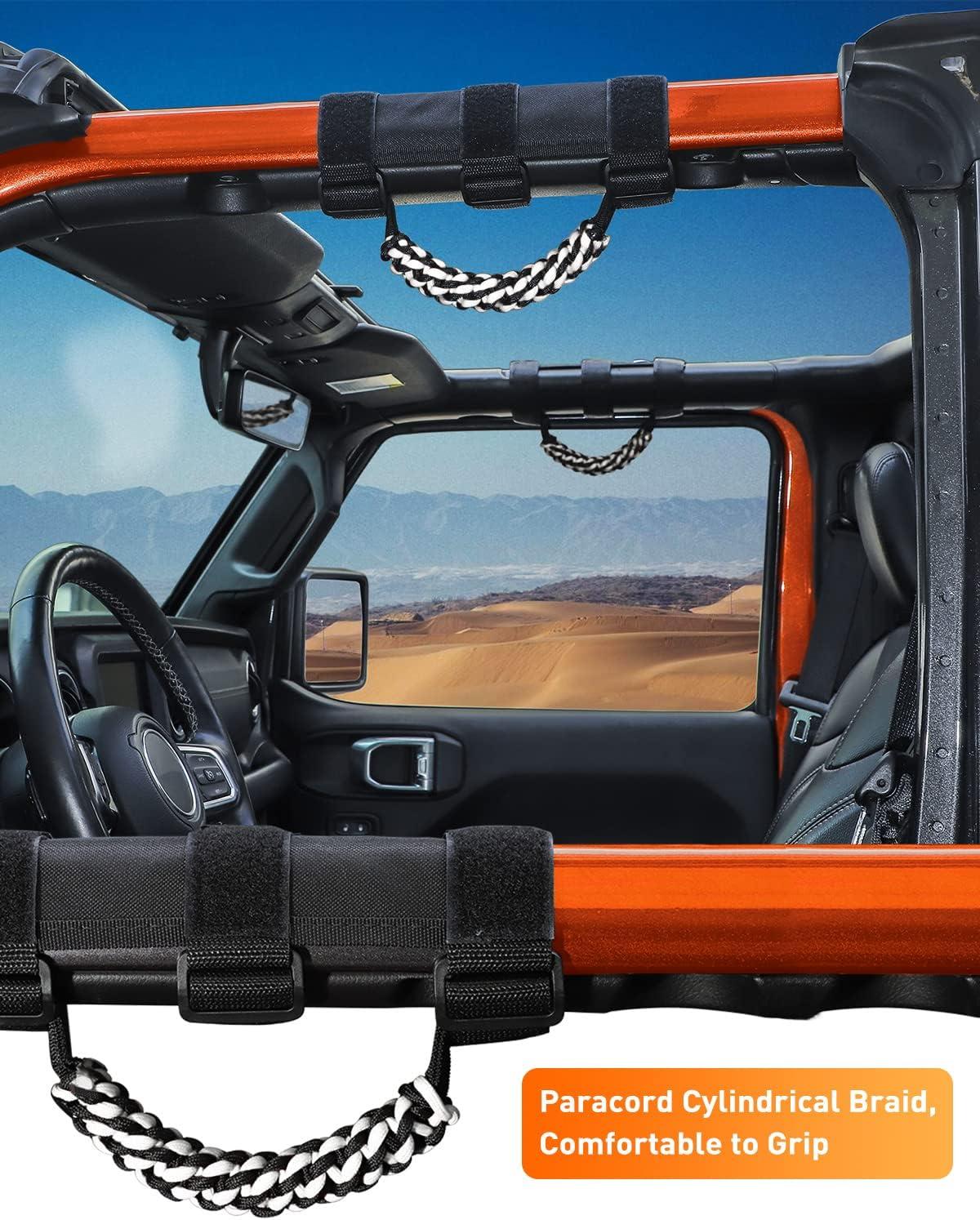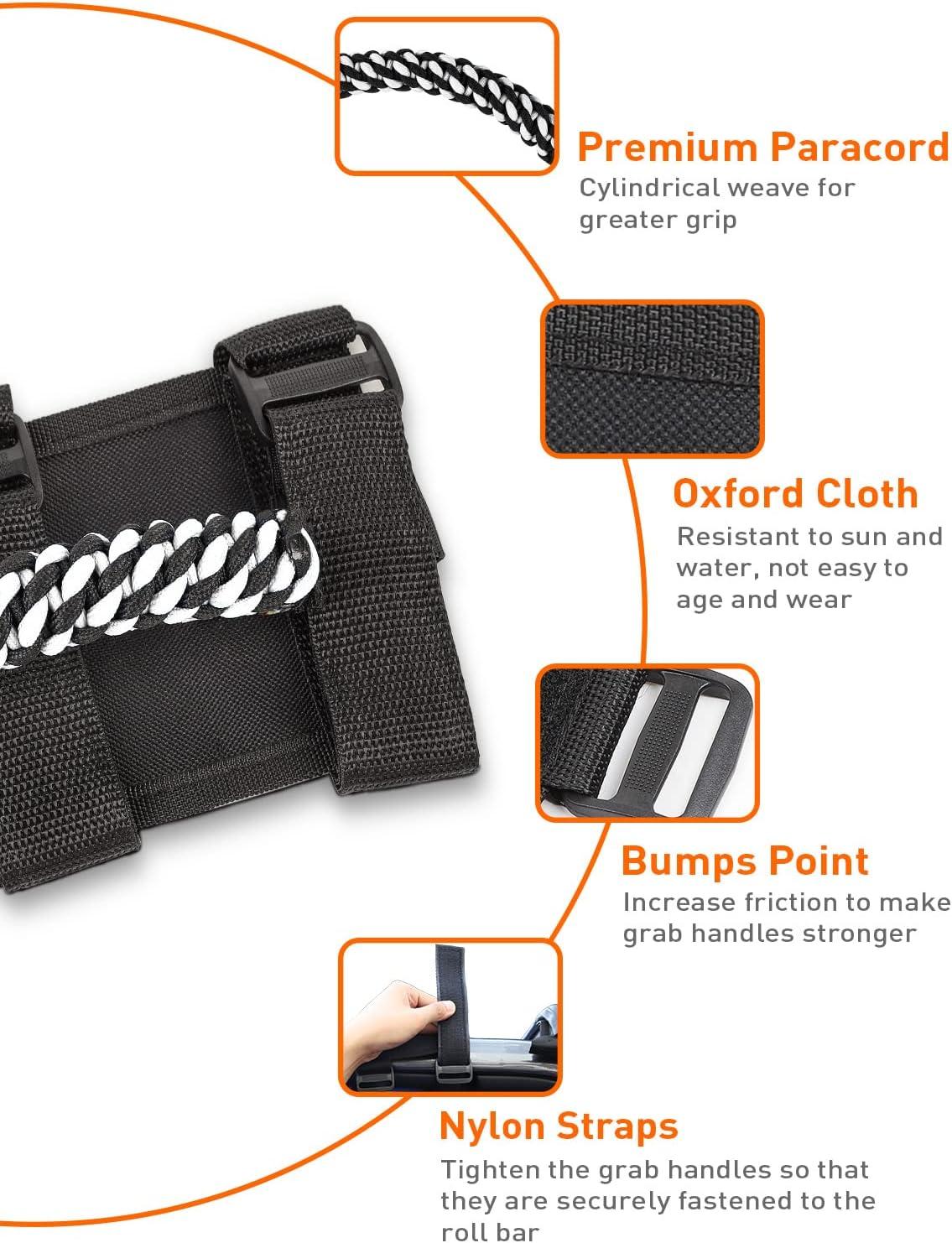 RUGGED DESIGN — Weave of Premium grade durable 7-strand braid nylon handle, matching high strength polyester oxford, make this jeep grab handles not only anti-wear and anti-tear for long-lasting reliability, but also through the soft rope material and cylindrical new weave shape, bring you a soft and comfortable grip feel.
