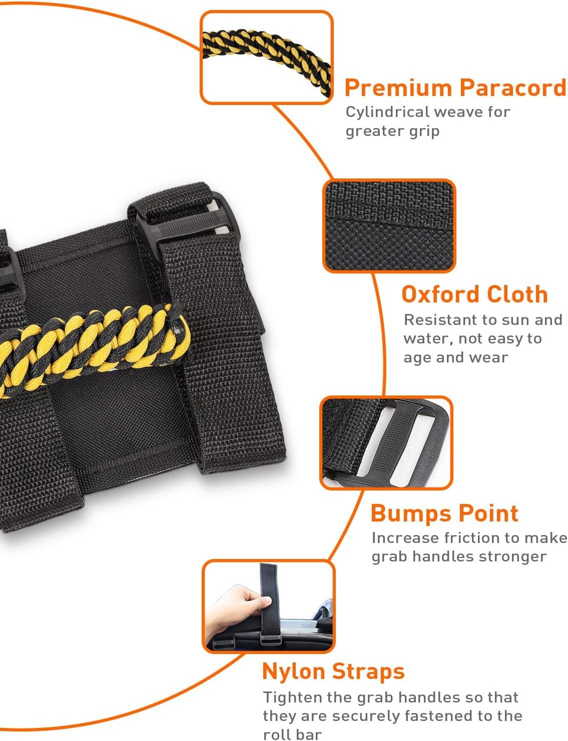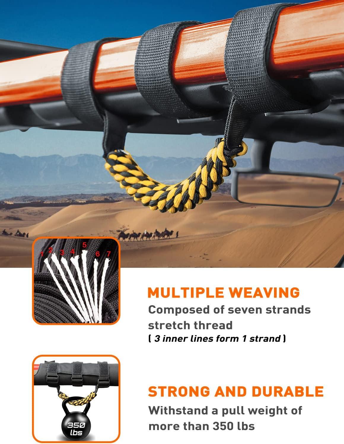 RUGGED DESIGN — Weave of Premium grade durable 7-strand braid nylon handle, matching high strength polyester oxford, make this jeep grab handles not only anti-wear and anti-tear for long-lasting reliability, but also through the soft rope material and cylindrical new weave shape, bring you a soft and comfortable grip feel.
