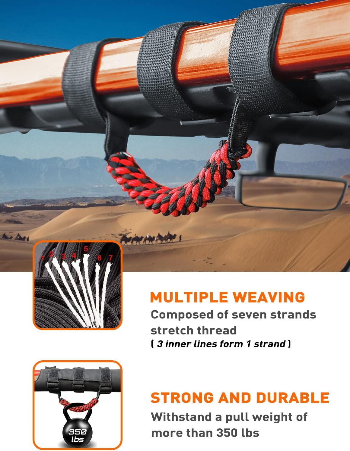 RUGGED DESIGN — Weave of Premium grade durable 7-strand braid nylon handle, matching high strength polyester oxford, make this jeep grab handles not only anti-wear and anti-tear for long-lasting reliability, but also through the soft rope material and cylindrical new weave shape, bring you a soft and comfortable grip feel.