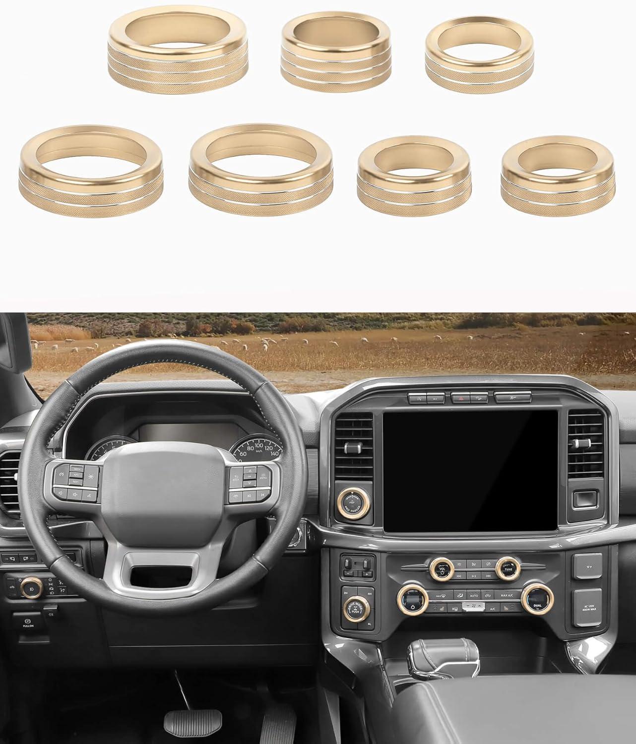 Savadicar 7-Piece Custom Machined Aluminum Knob Trim Ring Set for Ford F‑150 2021‑2025 – Headlight, 4WD, Trailer, HVAC, Radio Control Knob Covers – Interior Accessories Upgrade, Black(Glod)