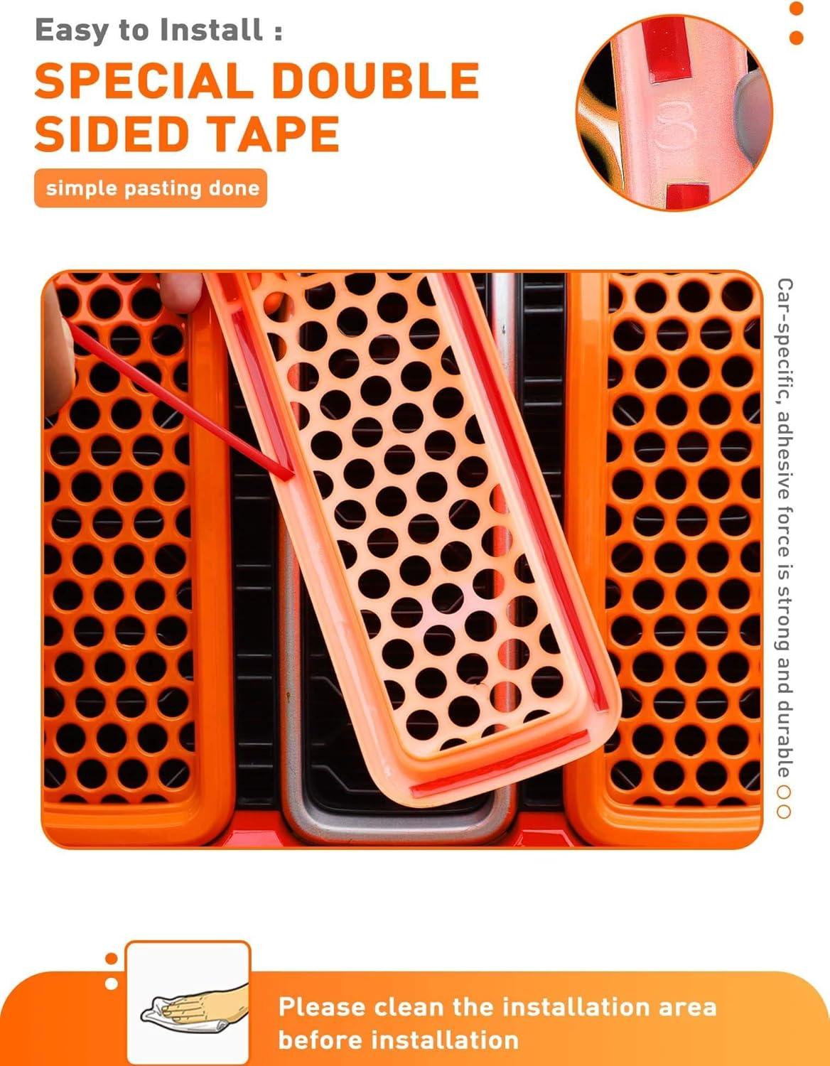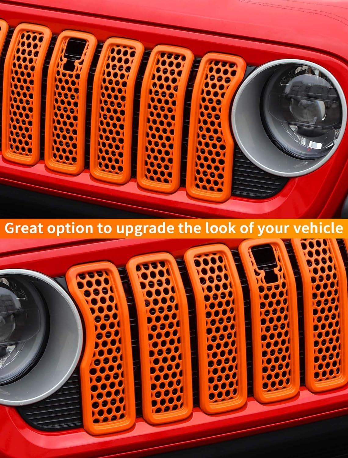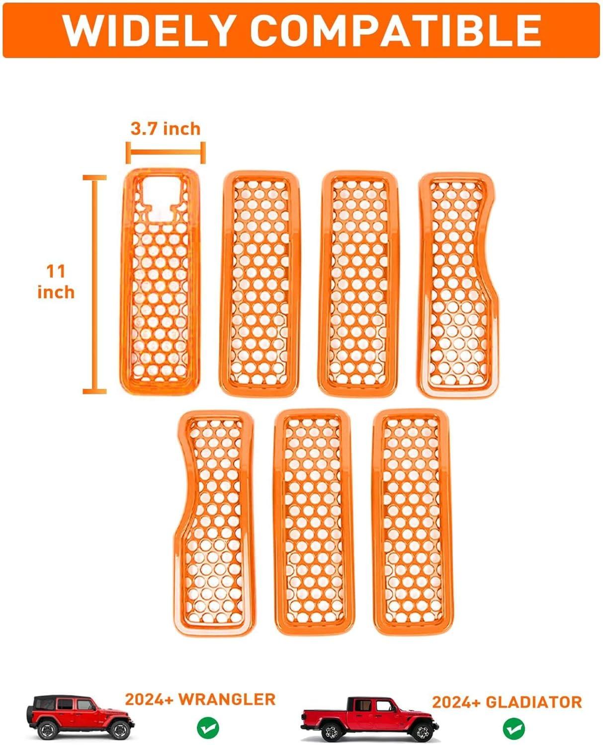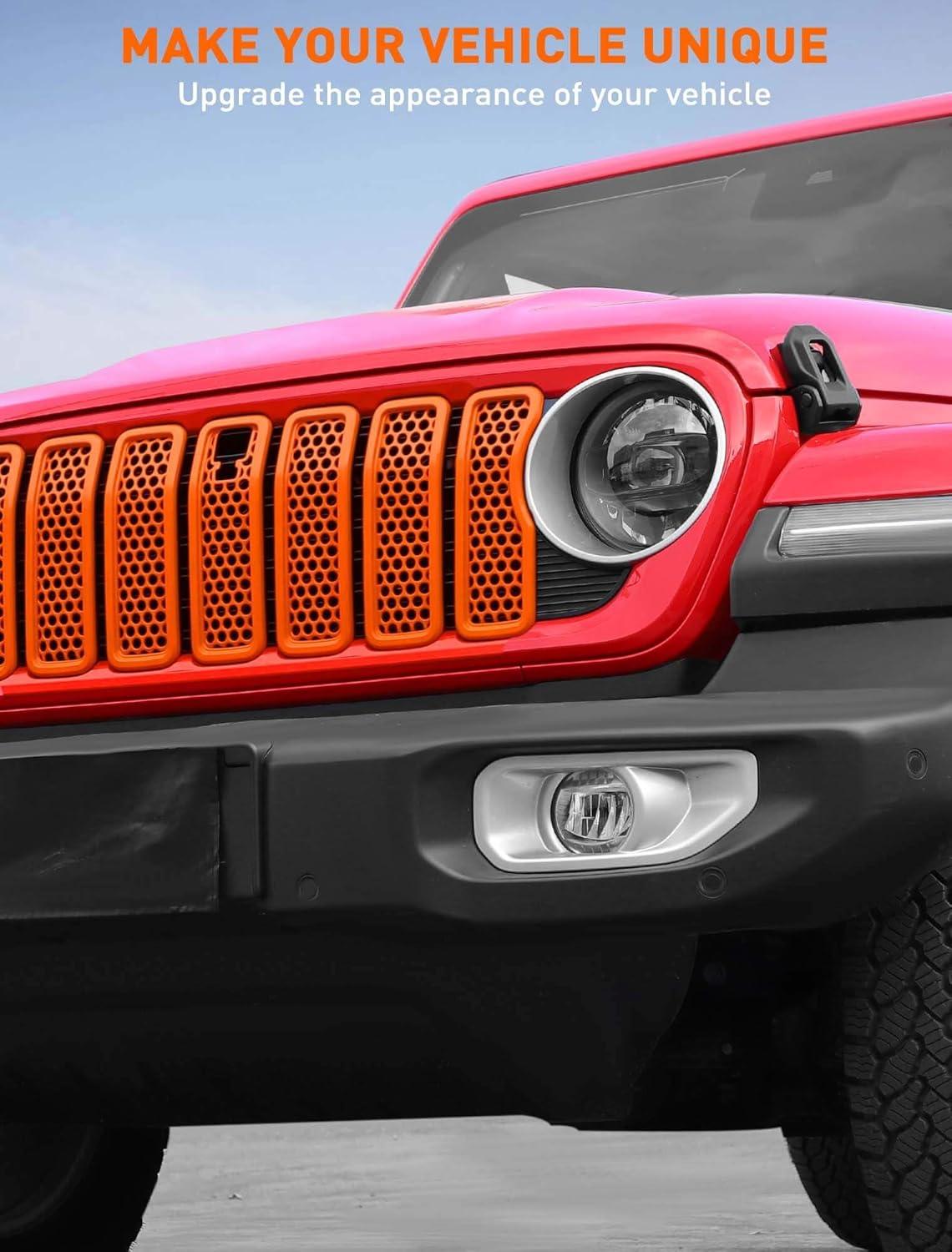 Savadicar Front Grill Inserts for 2024+ Jeep Wrangler JL JLU 4XE & Gladiator JT – Elevate Your Wrangler’s Aesthetics with Front Grille Cover Guard, Exterior Trim Accessories, 7 PCs, Orange(Mesh)