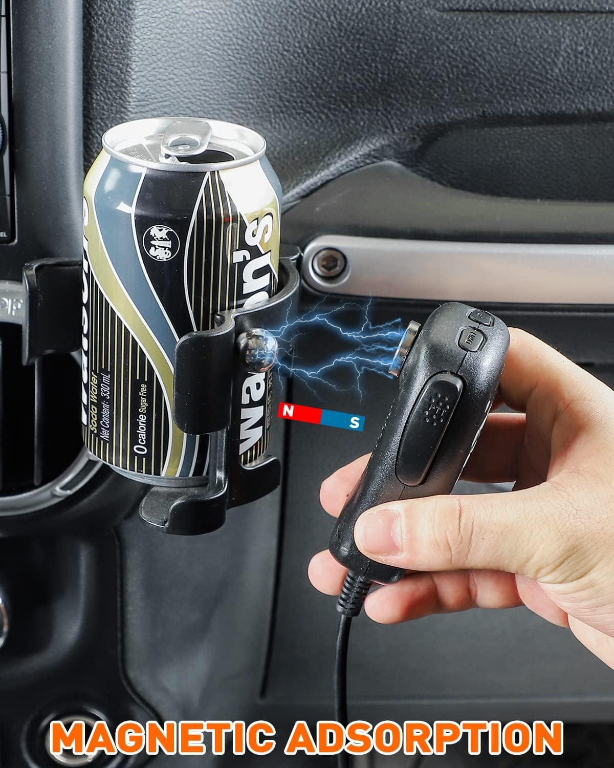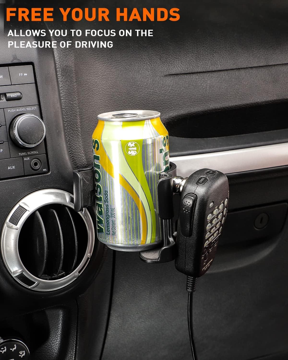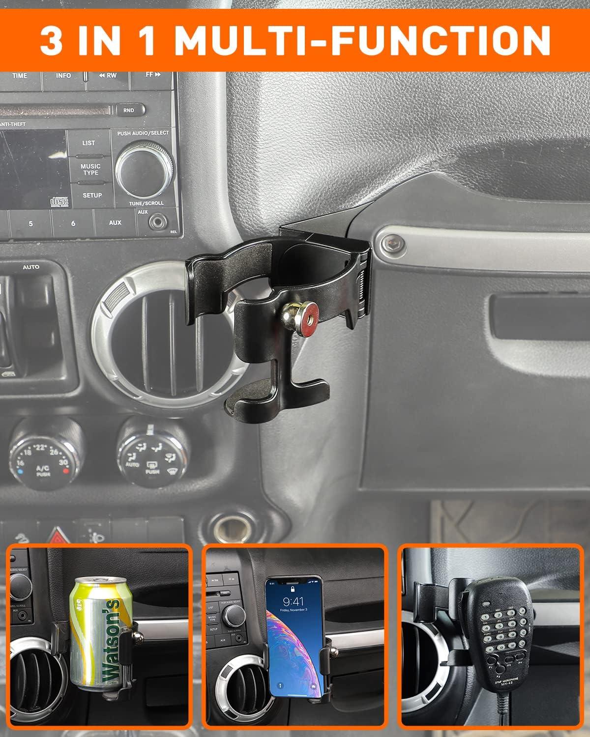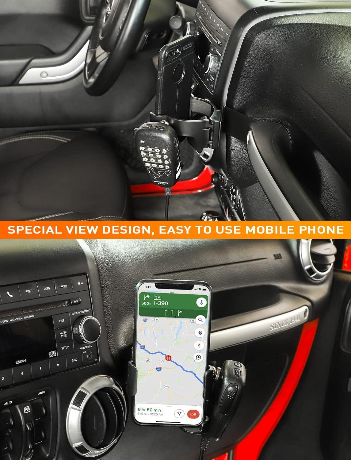 3-IN-1 FUNCTIONAL DESIGN — After careful improvement and design, this jeep phone holder combines three kinds of vehicle requirements commonly used by jeep owners, including mobile navigation, bottle placement and walkie-talkie placement. Convenient for your daily travel needs.