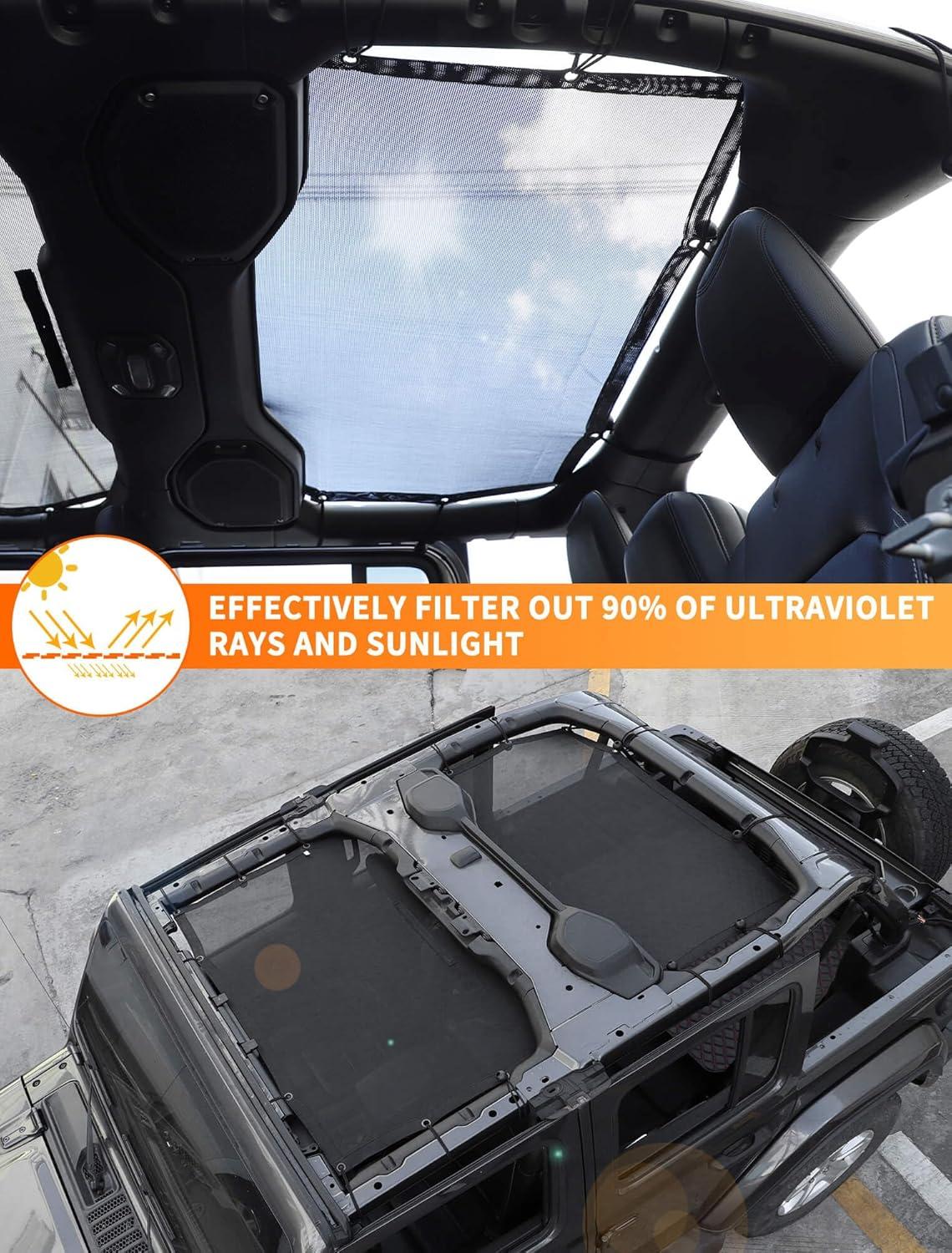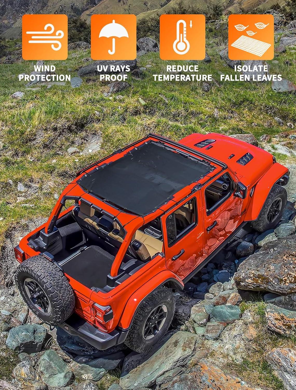 Experience ultimate comfort and protection with our sunshade top designed for 2018-2023 Wrangler JL JLU 4xe 4-Door Models. Our high-quality mesh sunshade provides superior UV protection, effectively blocking harmful UV rays, reducing interior heat, and preventing sunburns. The breathable mesh design allows air to flow freely, letting you enjoy a cool breeze while driving with the top down.