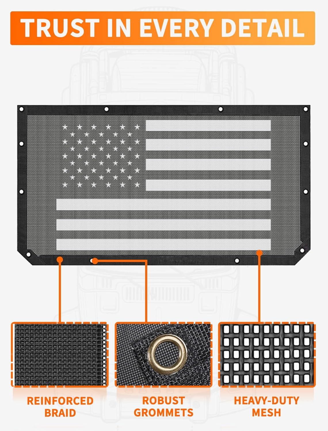 𝗗𝗨𝗥𝗔𝗕𝗟𝗘 𝗔𝗡𝗗 𝗟𝗢𝗡𝗚-𝗟𝗔𝗦𝗧𝗜𝗡𝗚 𝗠𝗔𝗧𝗘𝗥𝗜𝗔𝗟 — Made from premium, heavy-duty polyester mesh fabric, this Wrangler jl accessories is built to withstand harsh weather conditions and rugged off-road use. It's tear-resistant, anti-corrosive, and designed to last for years.