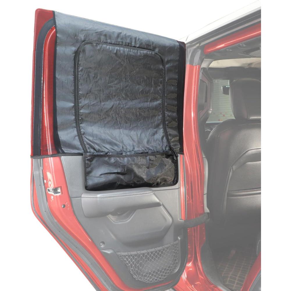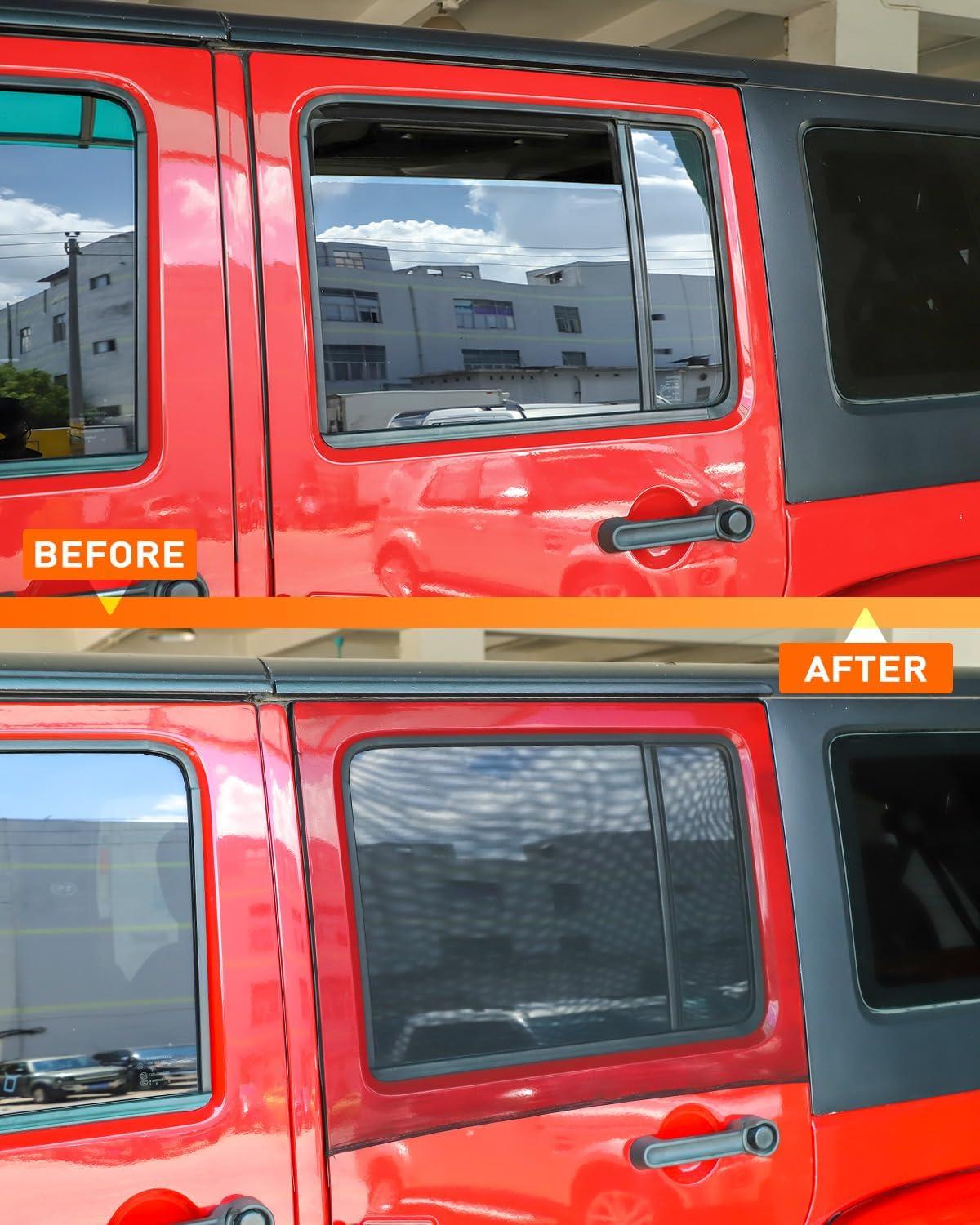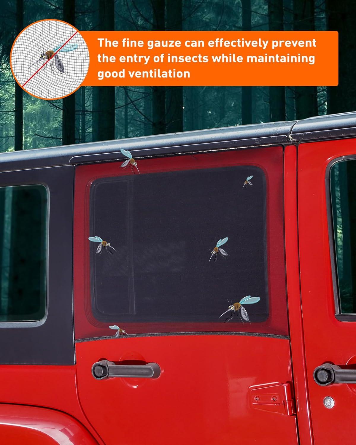 SIMPLE INSTALL — Constructed from high-stretch polyester fiber mesh, the surface is soft, flexible, and stretchable. Simply extend this Jeep sunshade over the vehicle's window frame for installation completed within minutes. Plus, it won't hinder the raising or lowering of the window glass, ensuring a straightforward and effortless process.