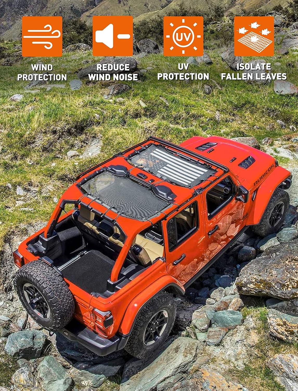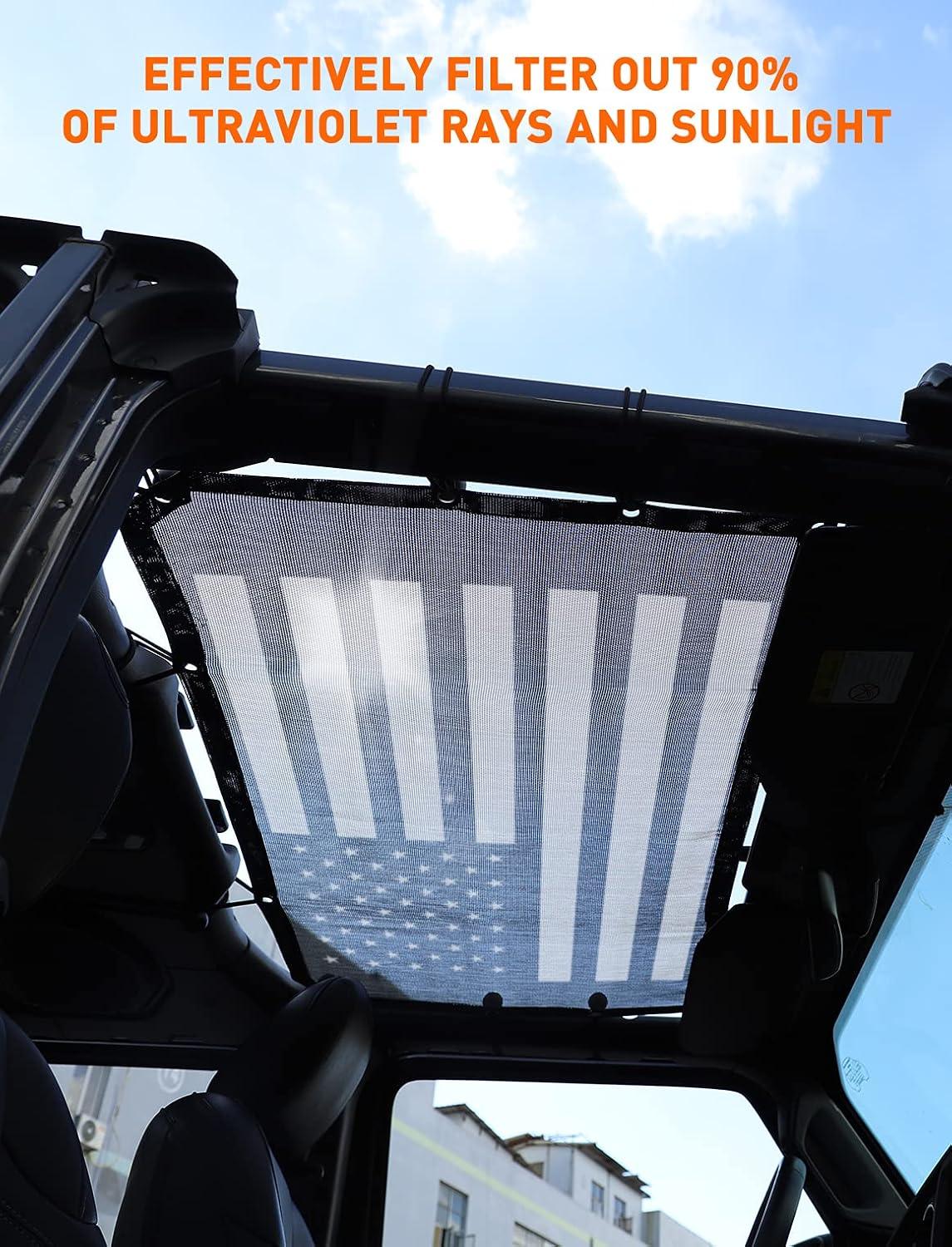 Savadicar Mesh Shade Top, Roof Sunshade Cover for 2018-2023 Jeep Wrangler JL JLU 4XE 4 Door, UV Protection & Heat Reduction for Enhanced Comfort on The Road, Durable Polyester, American Flag, Black(No Pattern)