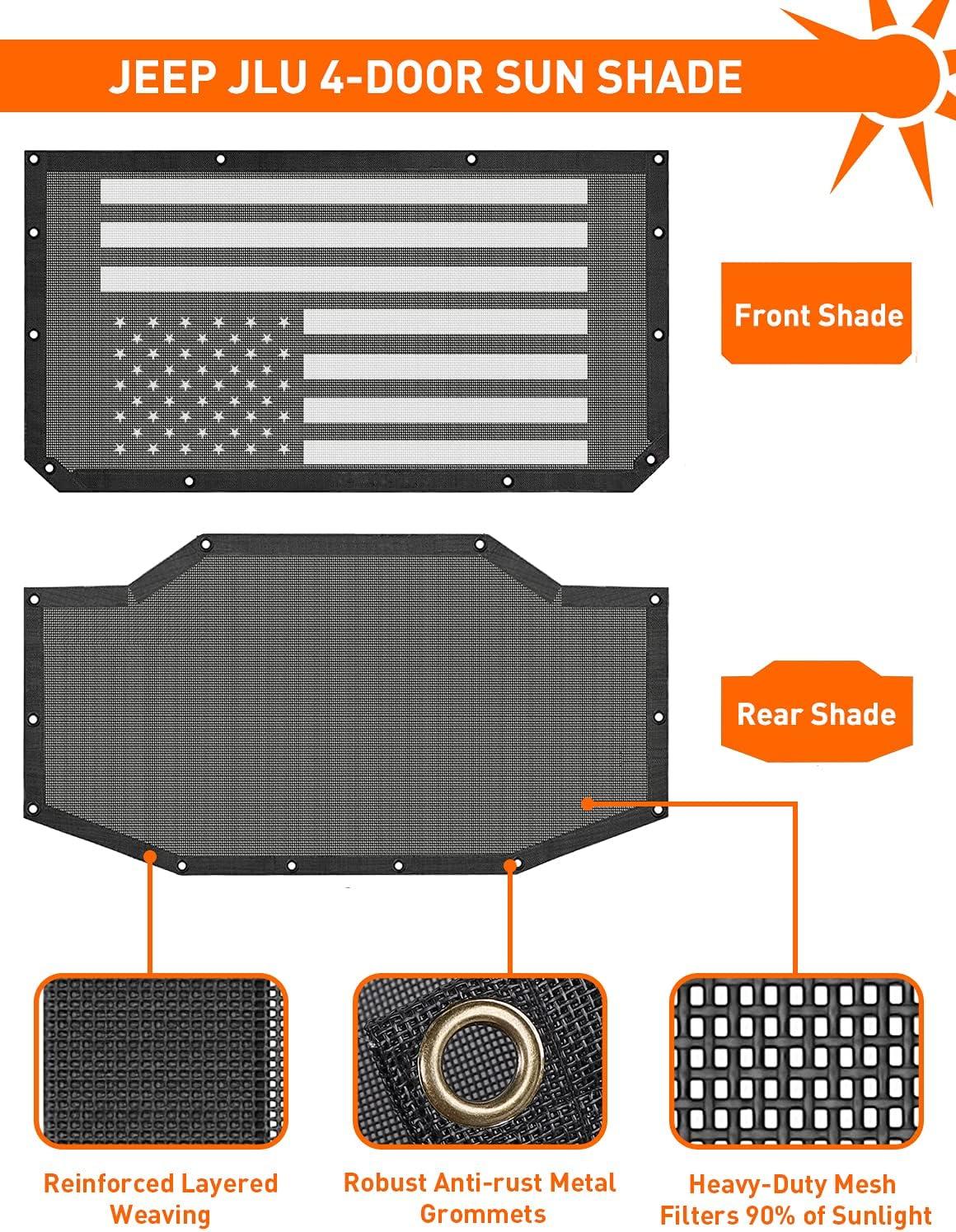 Savadicar Sunshade Top, Mesh Sun Shade Cover, UV Bikini Screen Blocker Compatible with 2018-2023 Jeep Wrangler JL JLU 4XE 4 Door, Front and Rear 2 Piece, Black(American Flag)