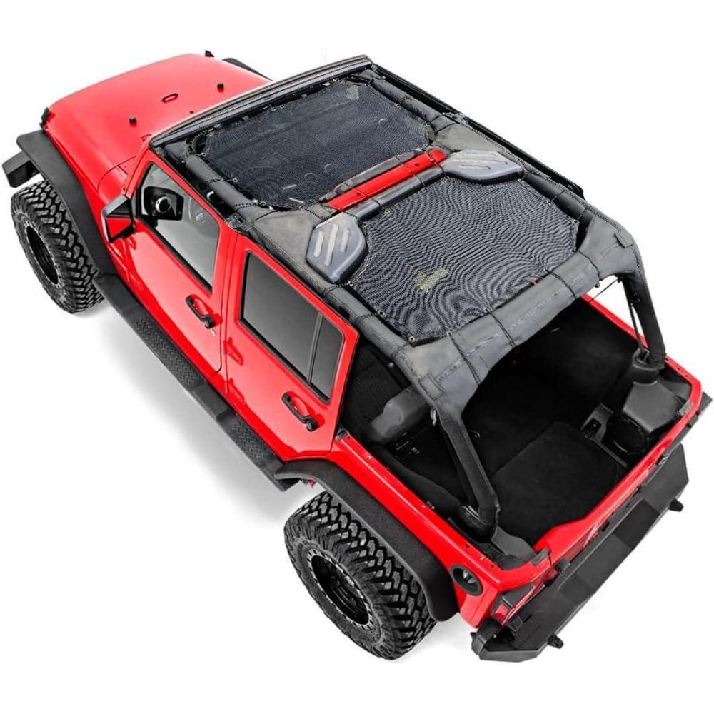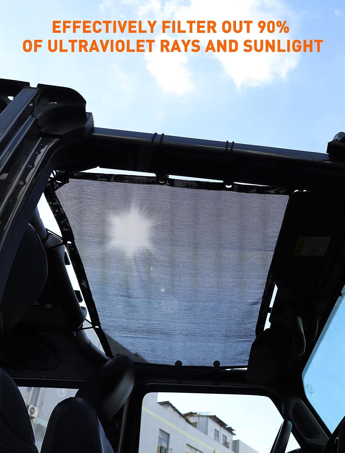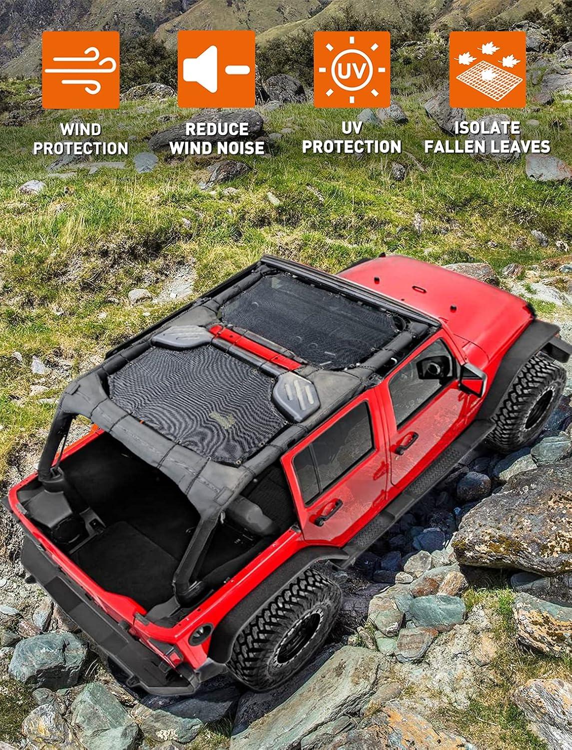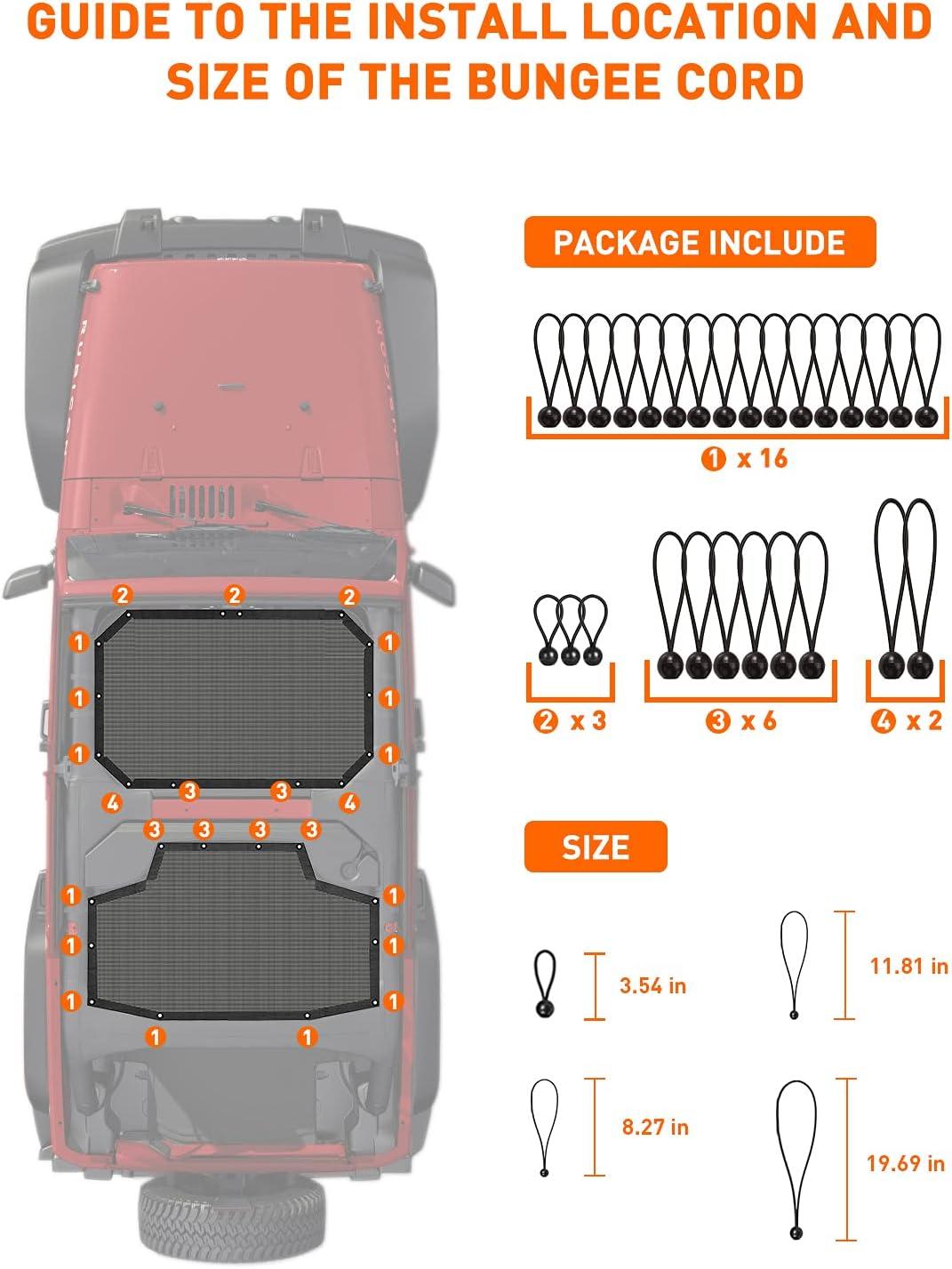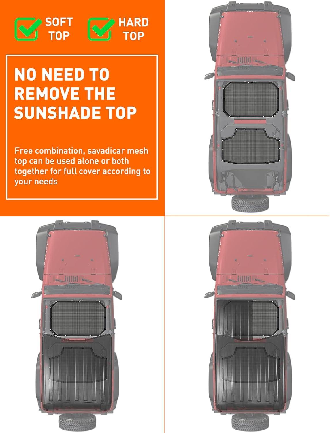 EASY INSTALLATION — No messy glue or drilling is required for installation, you can quickly install our jeep wrangler mesh top onto your Jeep using the included bungee cord. And compatible with soft and hard tops, so it is no need to remove your Jeep sunshade to add your hard top or soft top.