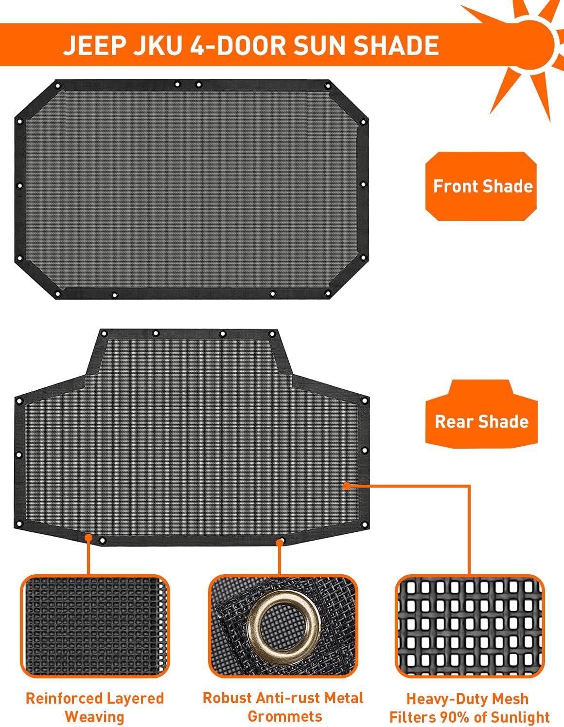 Savadicar Sunshade Top, Mesh Sun Shade Cover, UV Blocker Bikini Screen with USA Flag Pattern for 2007-2018 Jeep Wrangler JK JKU 4 Door, Front and Rear 2 Pieces, Durable Polyester, Black(No Pattern)