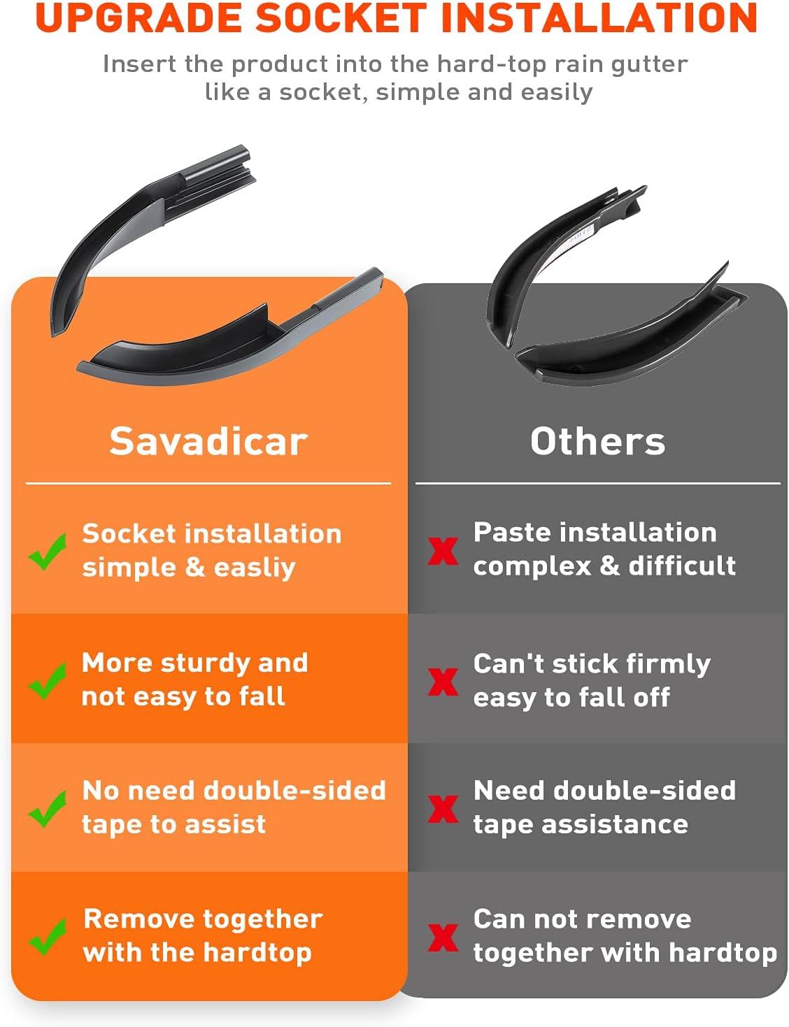 🔧 SIMPLE INSTALLATION — Unlike other rain gutter shunts that are installed by sticking, Savadicar's upgraded rain gutter diverter adopts a new socket installation method, without messy glue and car double-sided adhesive assistance. By embedding in the rainwater diversion groove, this wrangler jl accessories can firmly fixed on the roof freedom panel.