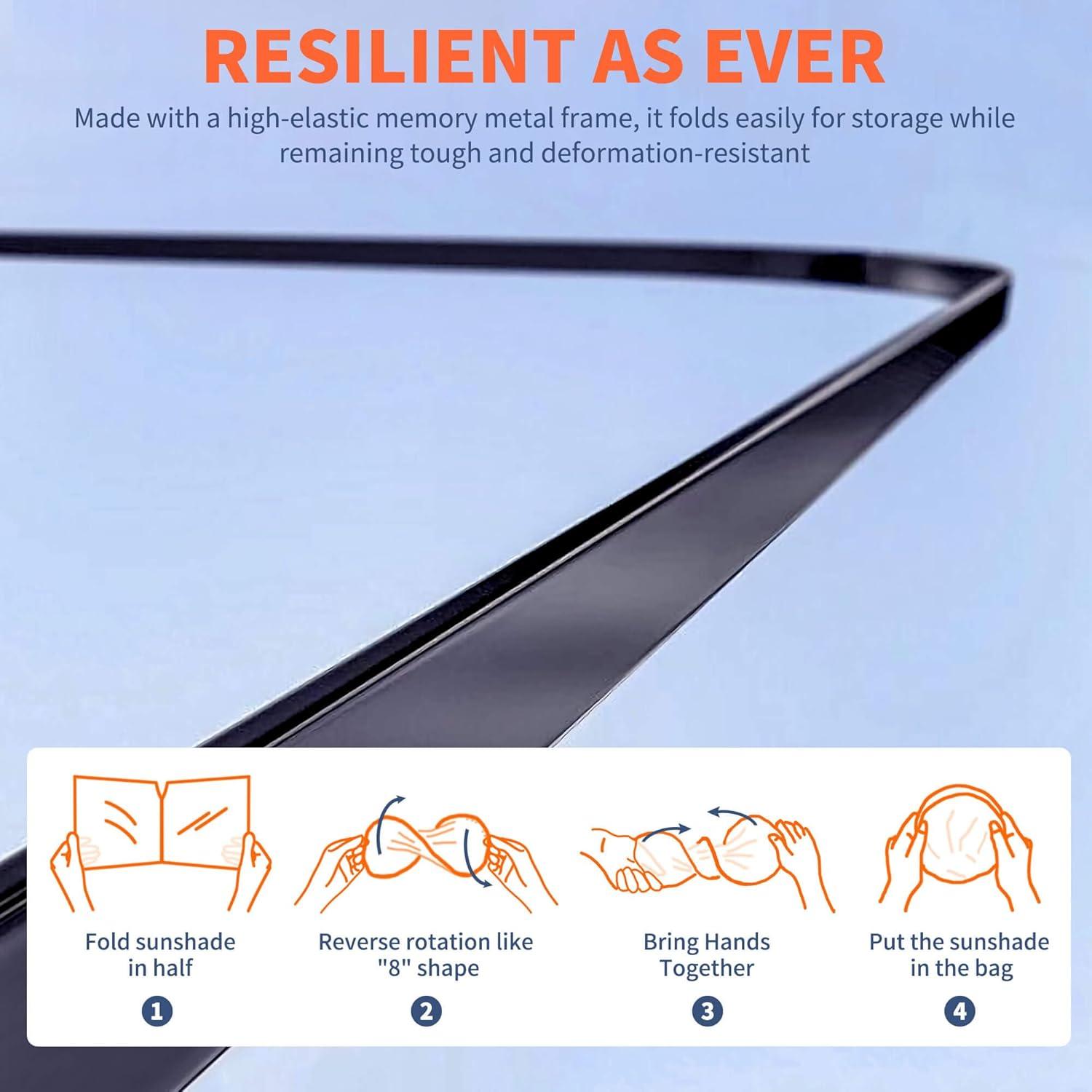 DURABLE MEMORY METAL FRAME — Engineered for exceptional flexibility and shape retention, the memory metal frame ensures a perfect fit against the windshield, resists deformation even after frequent use, allows effortless folding into a compact size for easy storage, and provides reliable UV protection in extreme temperatures