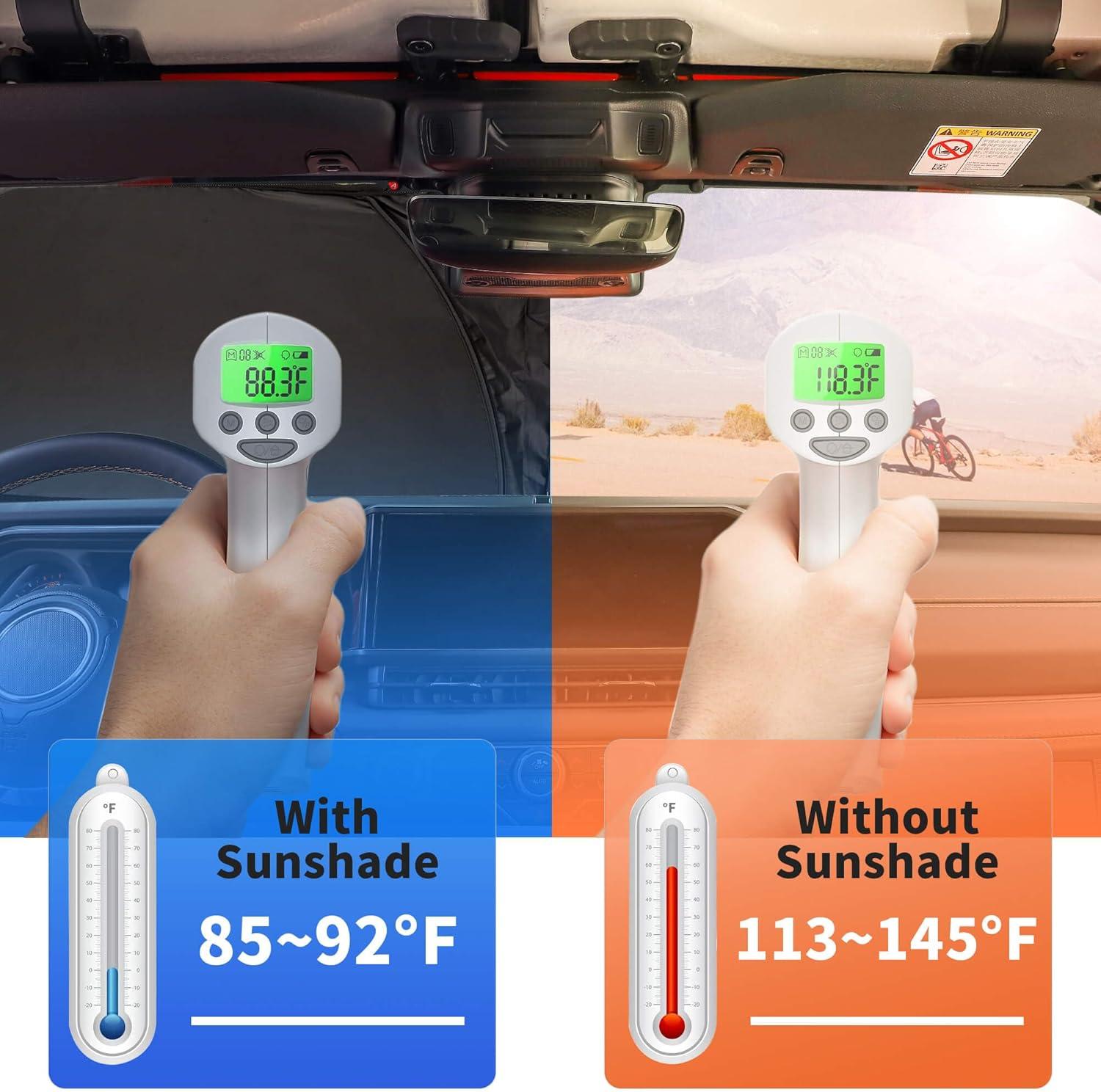 SUNLIGHT BLOCKER & UV RAYS CUTTER — Savadicar windshield sunshade with superior UV block-out (over 99.9%) and unrivalled heat reduction (over 90%). Reduce cracking and fading of accessories and sweltering heat caused by sun exposure inside the wrangler and gladiator